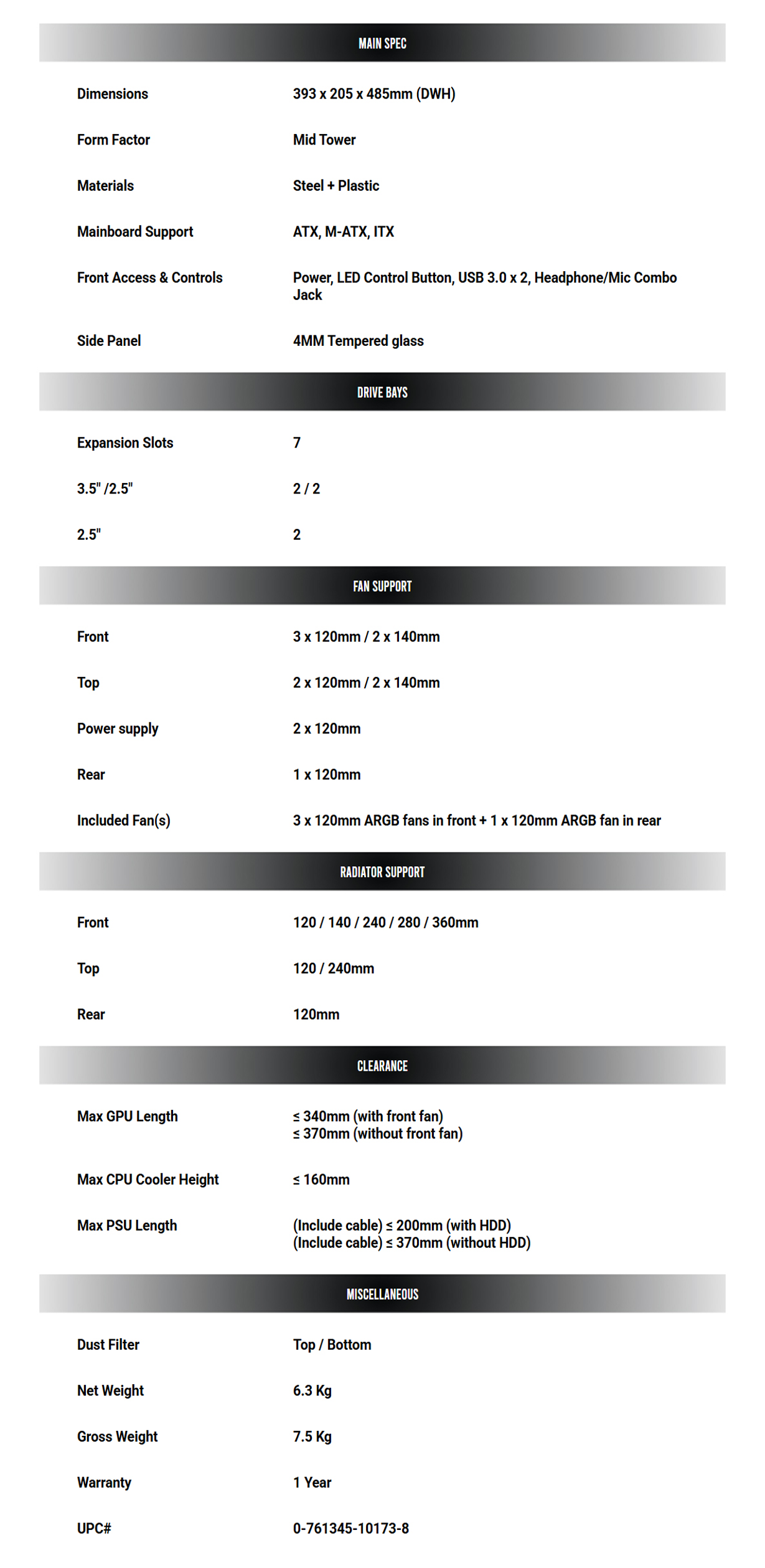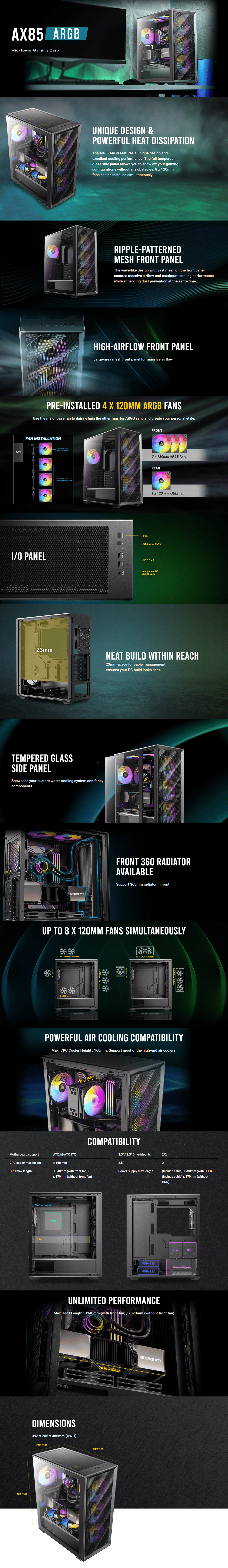 The AX85 ARGB features a unique design and excellent cooling performance. The full tempered glass side panel allows you to show off your gaming configurations without any obstacles. 8 x 120mm fans can be installed simultaneously.