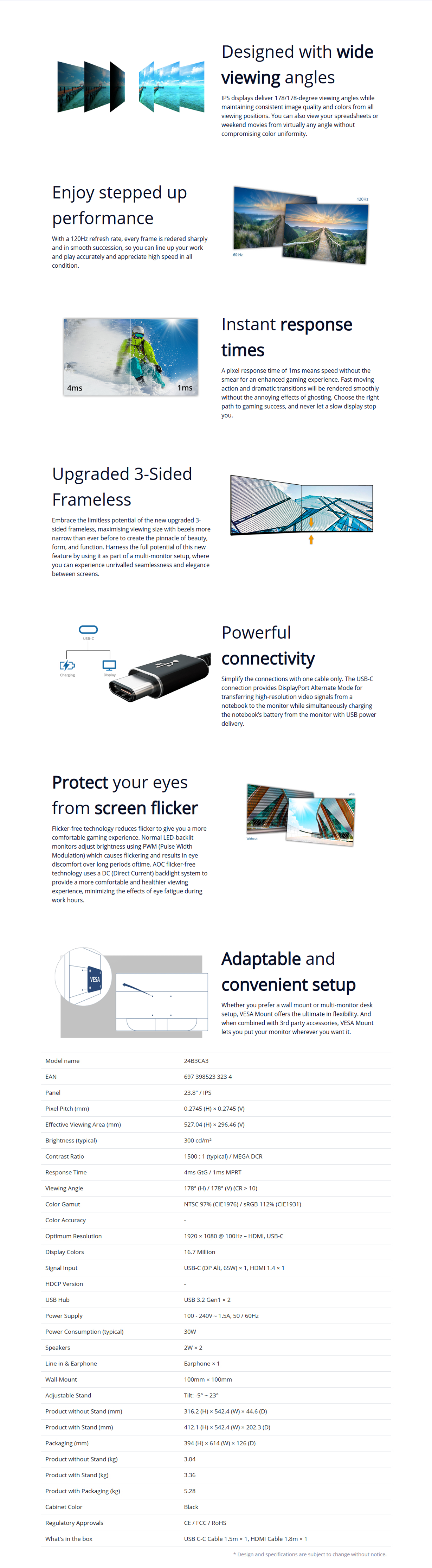 AOC 24B3CA3 23.8inch 120Hz FHD IPS Monitor, 1920x1080, 16:9, 1ms MPRT/4ms GTG, 1500:1 Contrast, 300 Nits, 1x HDMI 1.4, 1x USB-C (DP Alt Mode/65W), 2x USB-A 3.2 Gen 1, 2Wx2 Speakers, 3-Sided Frameless Design, Tilt, VESA 100x100mm
