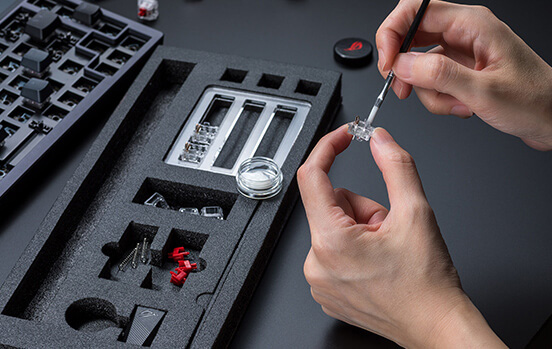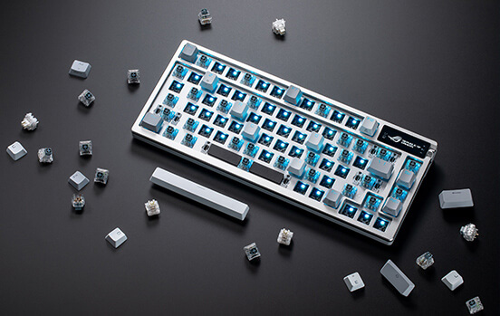 ROG Azoth is a 75% gaming keyboard bristling with DIY features traditionally found on premium custom keyboards. A metal top cover with silicone gasket mount and three-layer dampening, hot-swappable, pre-lubed ROG NX mechanical switches and keyboard stabilizer, ROG PBT doubleshot keycaps and bundled switch lube kit combine to create unprecedented typing experiences. ROG Azoth also has an OLED display with intuitive controls, versatile tri-mode connectivity with SpeedNova wireless technology in 2.4 GHz mode, three adjustable tilt positions, and MacOS support.