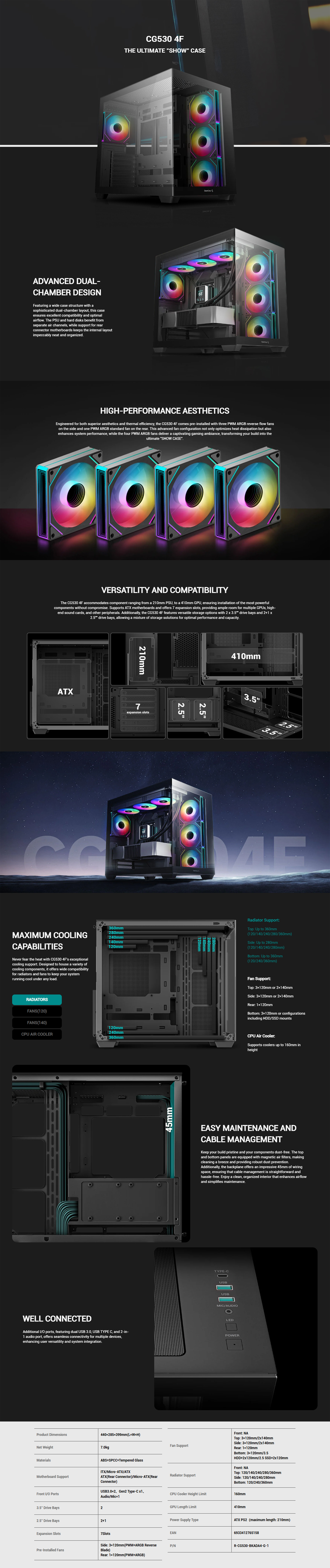Experience the ultimate showcase build with its pillarless design. Featuring a seamless, non A-pillar construction, the CG530 4F boasts both a tempered glass side panel and a glass front panel, providing a crystal-clear view of components into full display, turning it into a true work of art.