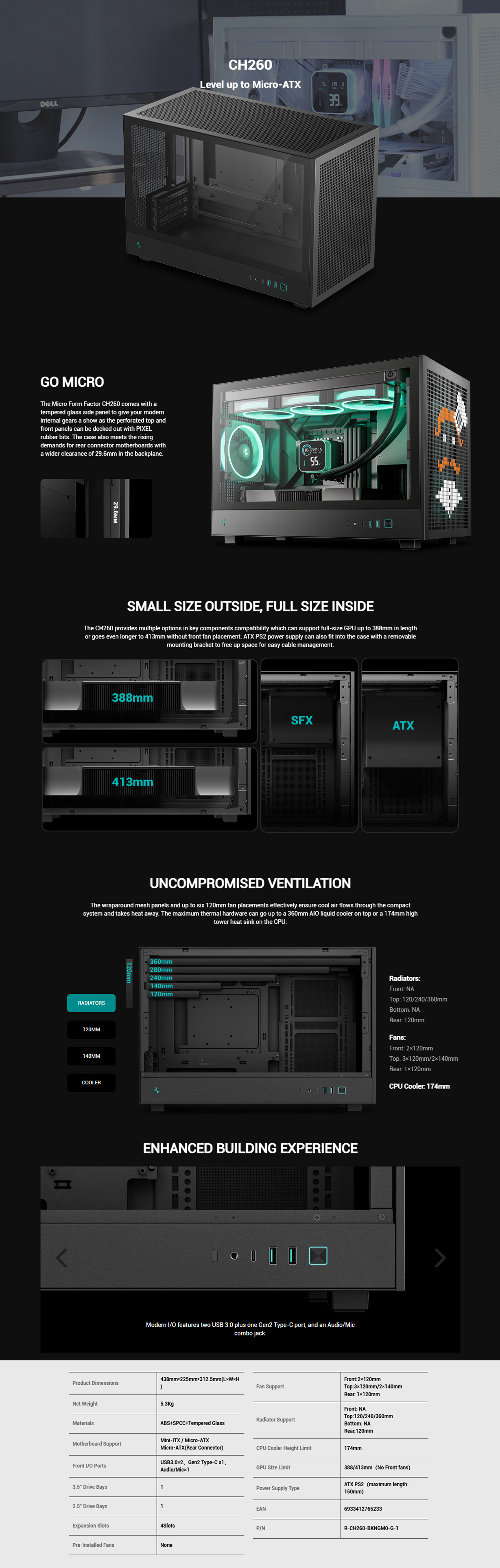 The CH260 is an expanded version of the classic DeepCool ITX case CH160, it is capable of containing up to M-ATX motherboard and inherited with the high airflow legacy thanks to the full steel mesh panel.