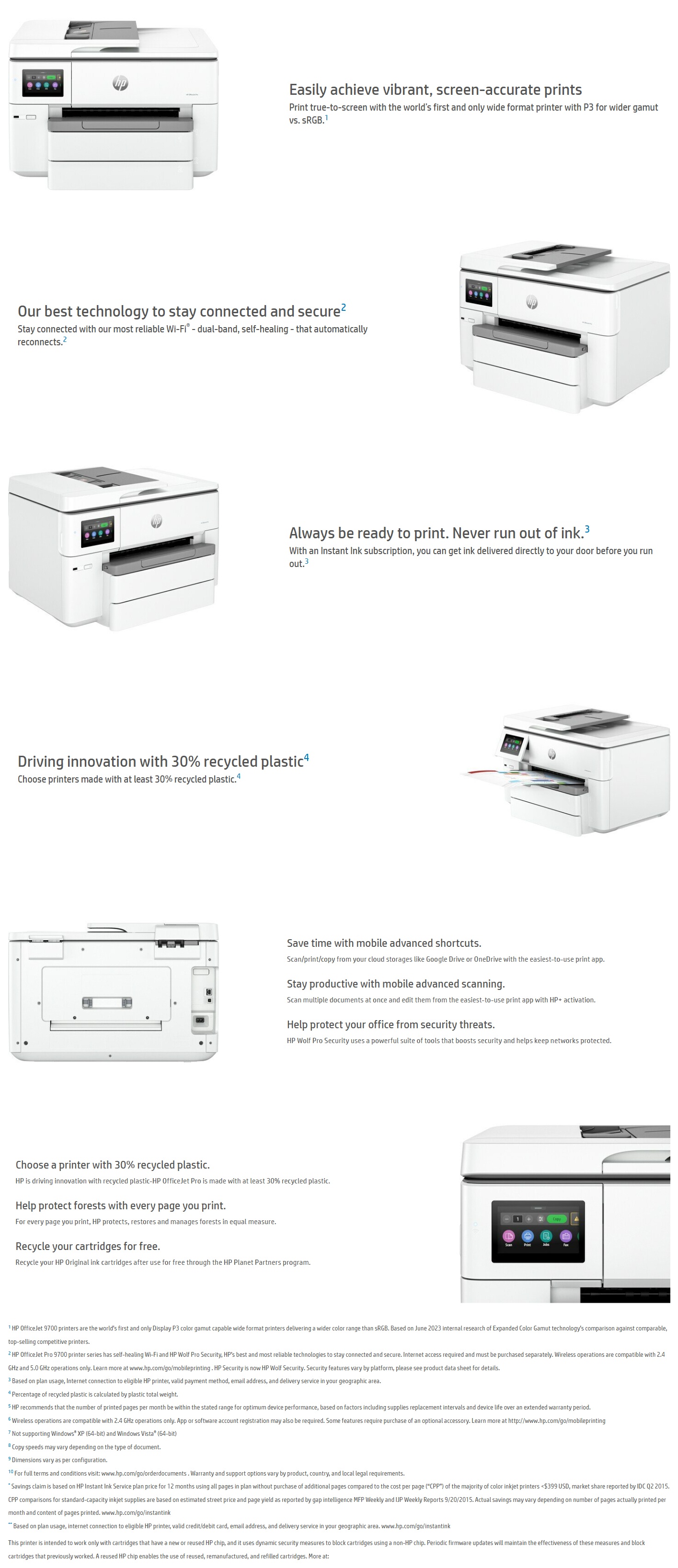 | Product long name specifications | HP OfficeJet Pro 9730e Wide Format All-in-One Printer, Small medium business, Print, copy, scan, Print from phone or tablet; Automatic document feeder; Two-sided printing; Two-sided scanning; Scan to email; Scan to PDF; Touchscreen; Wireless; Front USB flash drive port |