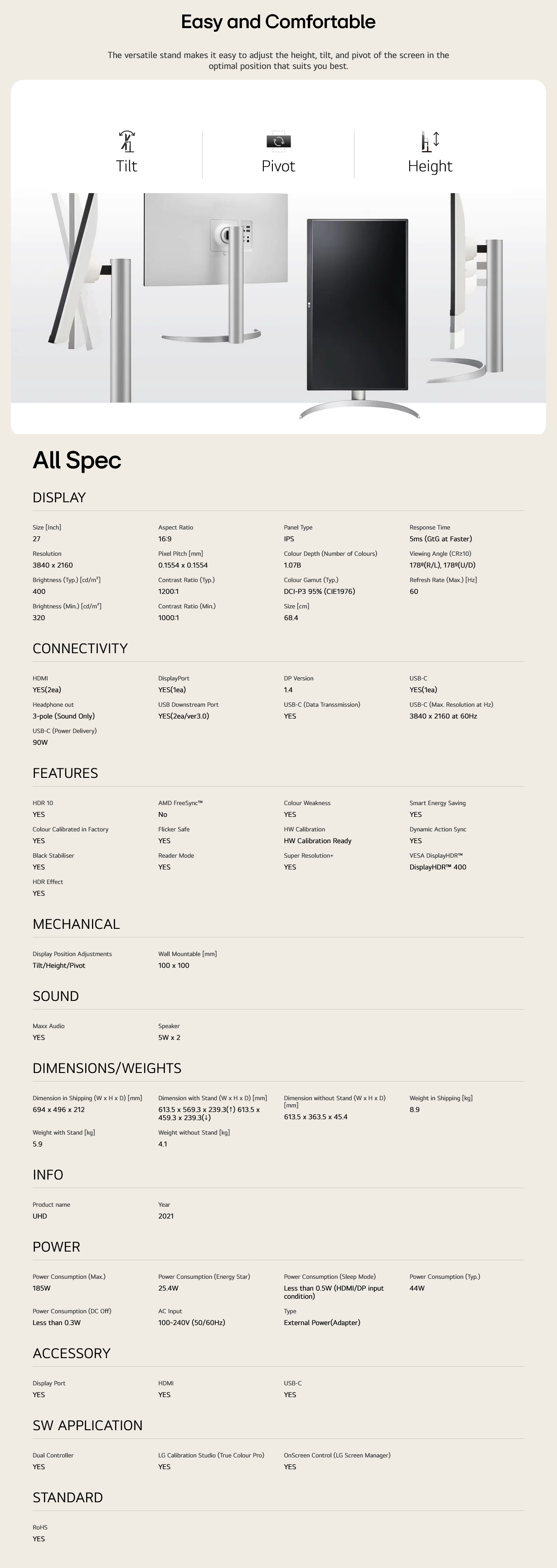 LG 27UP850K-W 27" 4K UHD 90W USB-C FreeSync HDR 400 IPS Monitor - Panel Size: 27" - Panel Type: IPS - Resolution: 3840 x 2160 - Aspect Ratio: 16:9 - Refresh Rate: 60Hz - Response Time: 5ms - Brightness (typ): 400cd/m2 - Contrast Ratio (Typ.): 1200:1 - Displayable Colours: 1.07B - Speakers: 5W x2 - I/O: HDMI x2, DisplayPort1.4, USB-C, Headphone Out, USB3.0 x2 - Ergonomics: Tilt/Height/Pivot - VESA: 100x100mm - AMD FreeSync - DisplayHDR 400 - 27UP850K-W