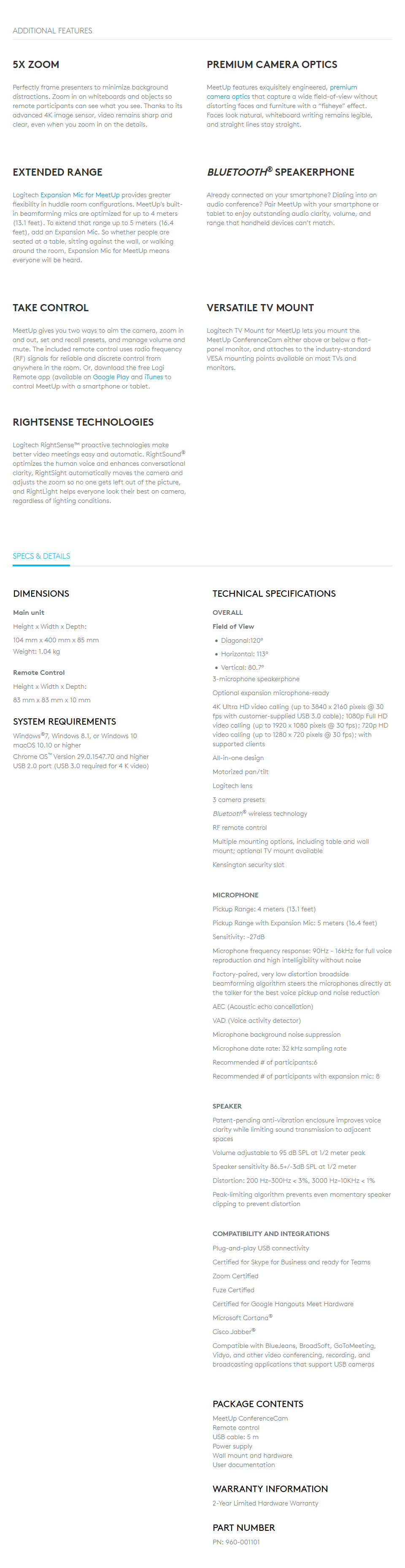 Logitech Meetup Video Conference Cam - Super Wide 120° Field of View - Ultra HD 4K Image Senso Sensor (3840 x 2160 @ 30 fps)- Bluetooth Technology - 3 Camera PResets - Motorized Pan/Tilt - USB 3.0 - 3x Integrated Microphones (4 Metres Pickup Range) - Wireless RF Remote Control - 960-001101