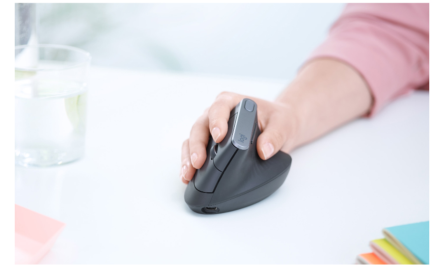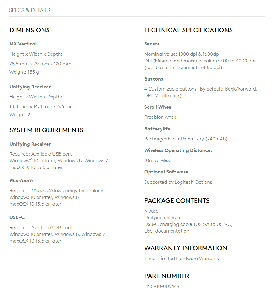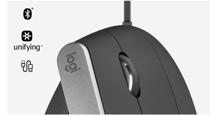 Logitech MX Vertical Advanced Ergonomic Mouse - 1ms Report Rate (1000 Hz) - Weight: 83G - 2 Side Buttons - DPI: 400 ~ 4000 - Unifiying Receiver or USB Connection - Wireless Range: 10m - 4x Customisable Buttons - USB-C Charging Cable - LIGHTSYNC RGB - 910-005449