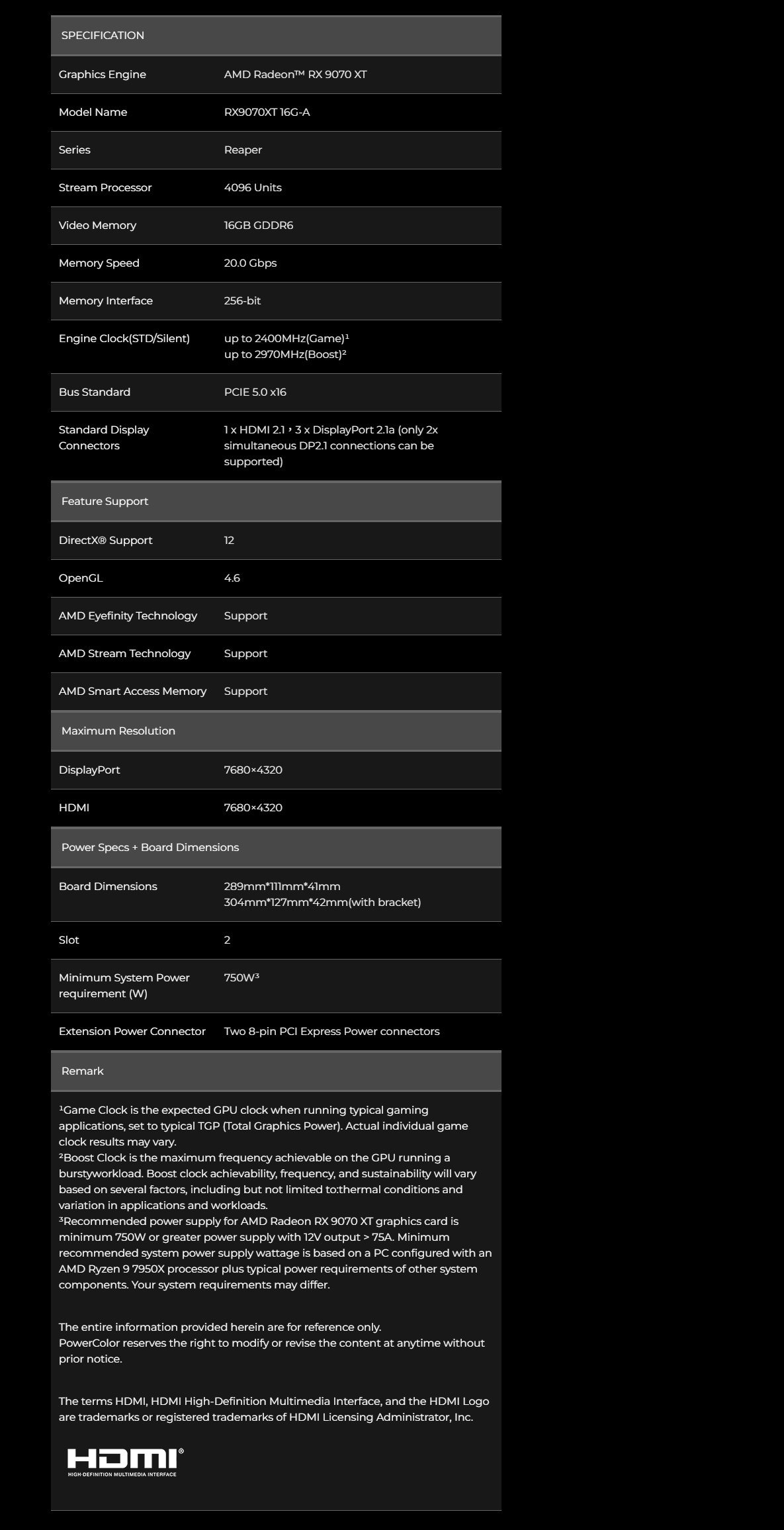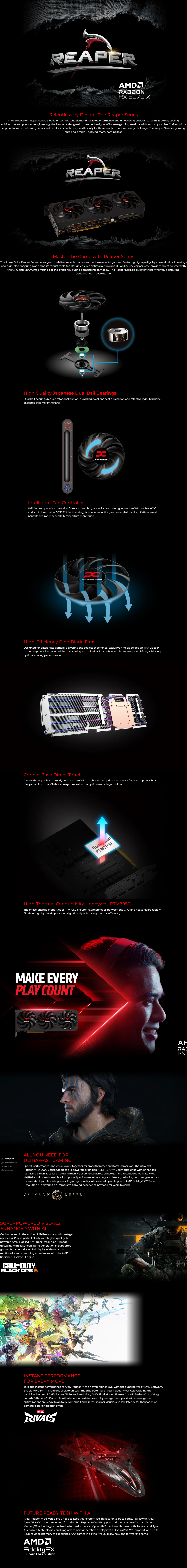 PowerColor Reaper Radeon RX 9070 XT 16GB-A (Boost: 2970MHz), 16GB GDDR6 (20Gbps), 256-bit, PCI-E 5.0 x16, 3x DisplayPort 2.1a, 1x HDMI 2.1, RDNA 4, AMD Radeon Anti-Lag 2, Metal Back Plate