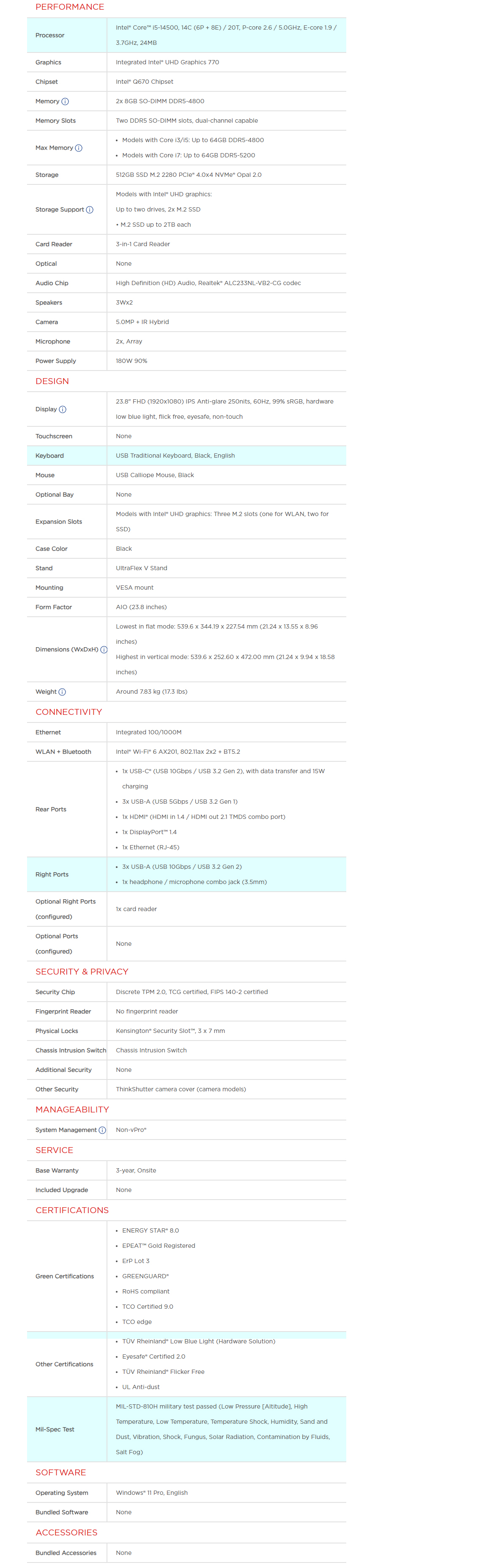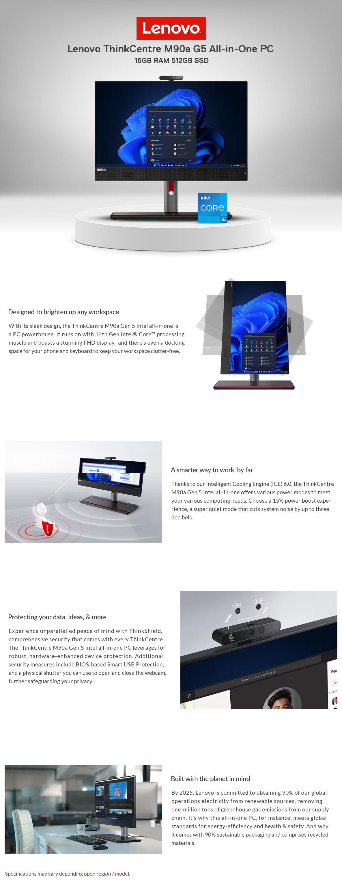Lenovo M90A G5 23.8" AIO PC i5-14500 16GB 512GB WiFi + BT W11P - CPU: Intel Core i5-14500 - Display: 23.8" FHD (1920x1080) IPS Anti-glare - Memory: 2x 8GB SO-DIMM DDR5-4800 - Storage: 512GB SSD M.2 2280 PCIe 4.0x4 NVMe Opal 2.0 - GPU: Integrated Intel UHD Graphics 770 - Keyboard & Mouse - Windows 11 Pro - 12SH001BAU
