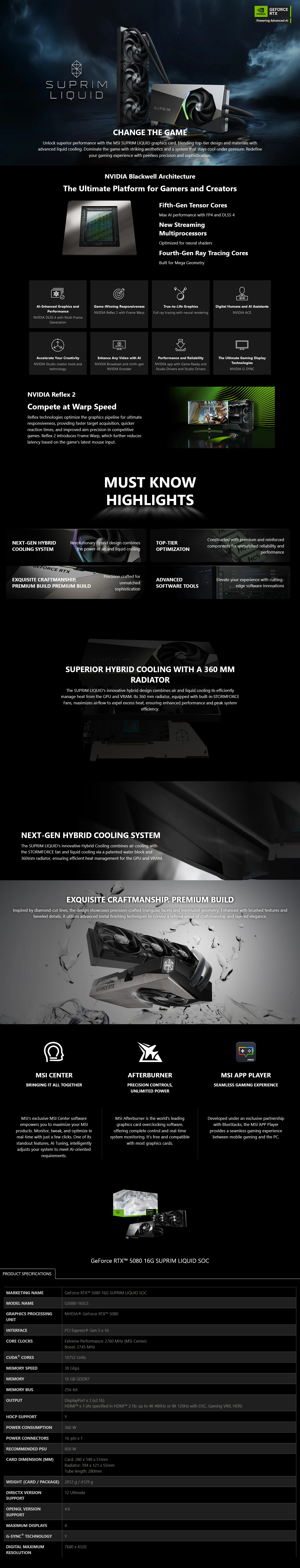 The GeForce RTX 5080 16G SUPRIM LIQUID SOC graphics card features 16GB GDDR7 256-bit memory interface, 30Gbps memory speed, PCIe 5.0, 1 x HDMI 2.1b, 3 x DisplayPort 2.1a, DirectX 12 support and OpenGL 4.6 support.