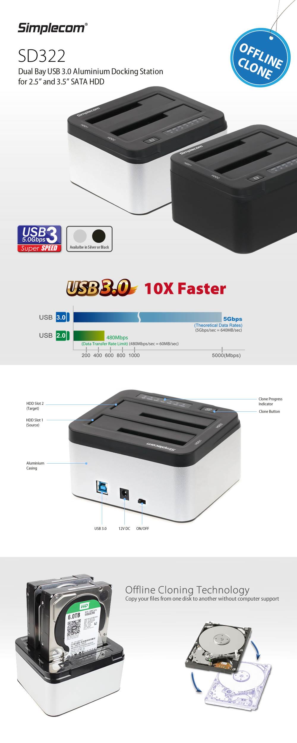 Simplecom SD322 Dual Bay USB 3.0 Aluminium Docking Station - Black - Designed for 2x 2.5 inch or 3.5 inch SATA HDD/SSD - USB 3.0 SuperSpeed, transfer rates up to 5Gbps - Backwards-Compatible with USB 2.0